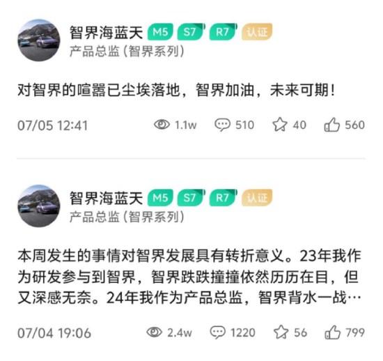 鸿蒙智行智界系列产品总监海蓝天日前的发声也从侧面印证了这一分析。7月4日和5日,他在鸿蒙智行App中接连发文称:“本周发生的事情对智界发展具有转折意义。23年我作为研发参与到智界,智界跌跌撞撞依然历历在目,但又深感无奈。24年我作为产品总监,智界背水一战后面的矛盾冲突让人心有余悸。本周之后,智界可以全力向前奔跑!感谢智界车主对智界的厚爱和支持,让我们一同陪着智界成长!”“对智界的喧器已尘埃落地,智界加油,未来可期!”