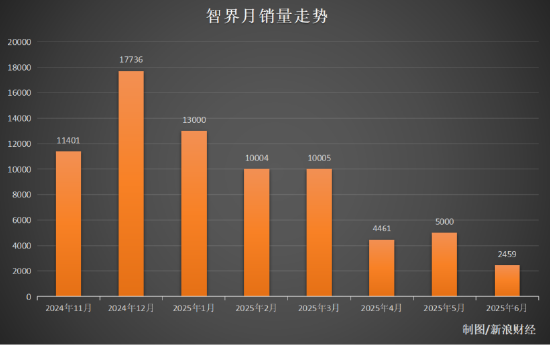 这两次舆论风波也明显影响了智界的销量。《次世代车研所》梳理智界品牌近来的销量数据发现,其在2024年12月销量为17736辆达到巅峰。但今年以来,销量数据下滑明显——4月跌破了5000辆仅4461辆,6月更是下滑至2459辆,创下新低。